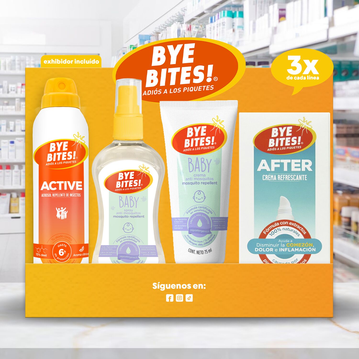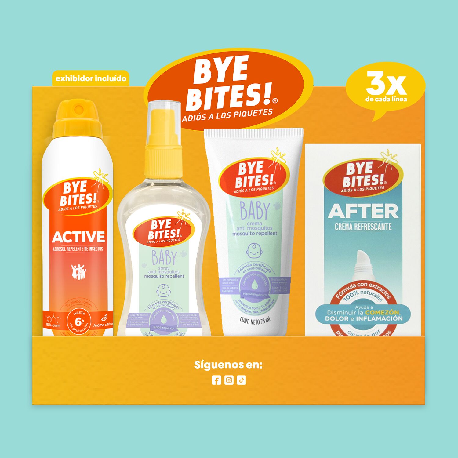 Bye Bites Baby es un repelente de insectos en versión spray y crema diseñado especialmente para piel de bebés ya que es suave y delicado gracias a sus extractos de manzanilla y Aloe Vera; se recomienda el uso a partir de los 2 meses. Gracias a su fórmula hipoalergénica libre de sulfatos y parabenos. Es eficaz, seguro y brinda una protección duradera.